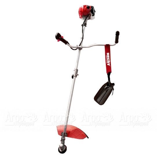 Эргономичная рукоятка, имеющая форму велосипедного руля, и обрезиненными накладками на ручках, обеспечивают удобство ведения инструмента. Руль можно закреплять на штанге на желаемой высоте для удобства работы конкретного пользователя. Для кошения используются разные режущие насадки -головка с леской или нож. В комплектацию изделия входит плечевой ремень.