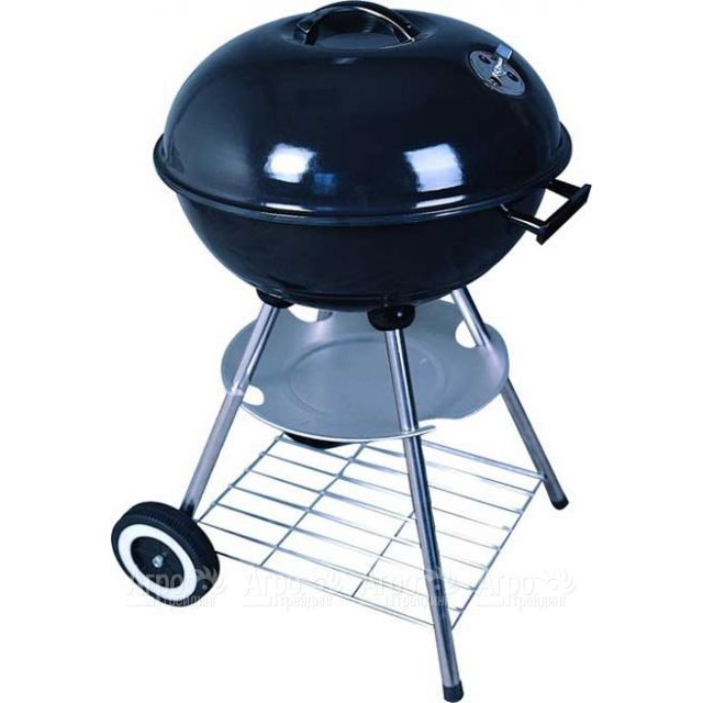 Гриль-коптильня круглого сечения на колесиках с крышкой, с пластиковыми ручками, 2 нижние полочки, 2 регулятора подачи воздуха, высота 86 см, диаметр 53 см, на 4-х ножках, крышка черного цвета.