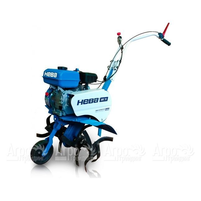 Мотокультиватор Нева МК-70 укомплектован мощным и надёжным бензиновым двигателем, потребляющим чистый бензин. Мотор имеет защиту от перегрузок и короткого замыкания. Редуктор машины цепной, корпус изготовлен из стали. Потребление топлива минимальное. Не одной заправки топливного бака можно обработать несколько соток земли. Сцепление ременное. Количество передач: одна. Все элементы управления агрегатом удобно расположены на эргономичной рукоятке, которая может складываться пополам в транспортном положении или во время хранения.